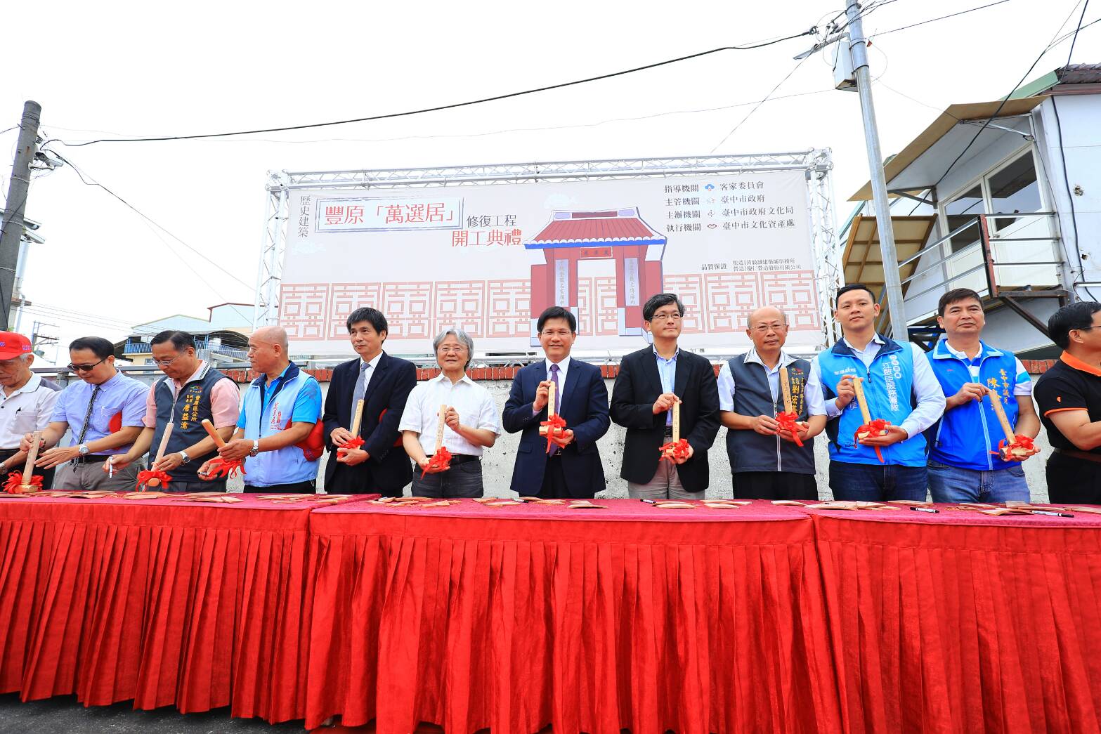 林市長今(26)日在文化局長王志誠與客委會主委劉宏基的陪同下主持開工典禮,行政院客委會副主委楊長鎮、市議員陳清龍、陳本添等人均出席參與,立委江啟臣與市議員翁美春也派代表到場關心,眾人一起執金錘,敲除原本萬選居的紅瓦片,象徵去新復舊重展風華意象,氣氛隆重熱鬧,現場也吸引許多民眾共同觀禮。
