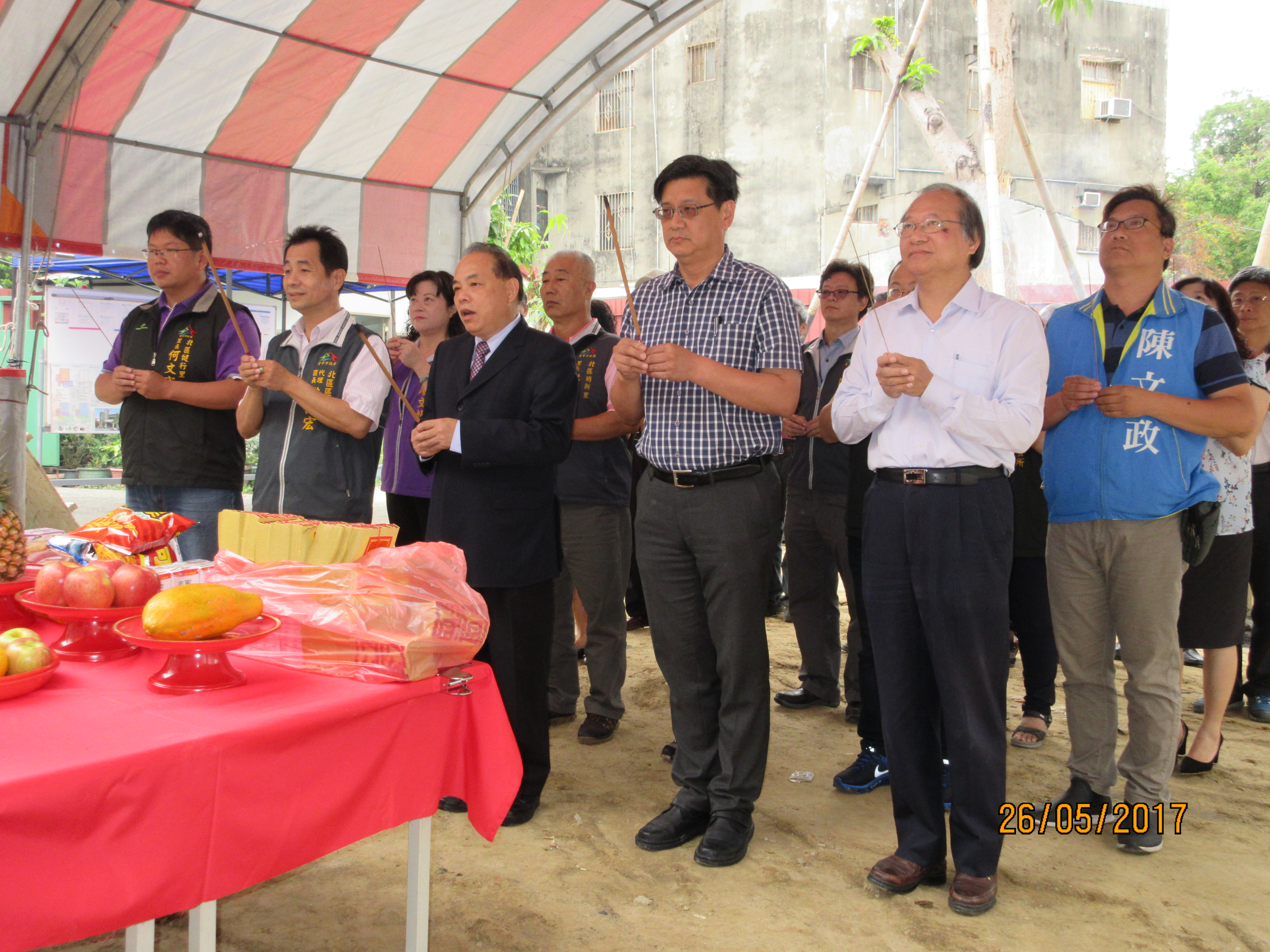 上樑典禮由市府民政局長蔡世寅主持,北區區長洪誌宏、健行里里長何文宏、明新里里長洪平東等人也到場參加,祈求工程順利完工。