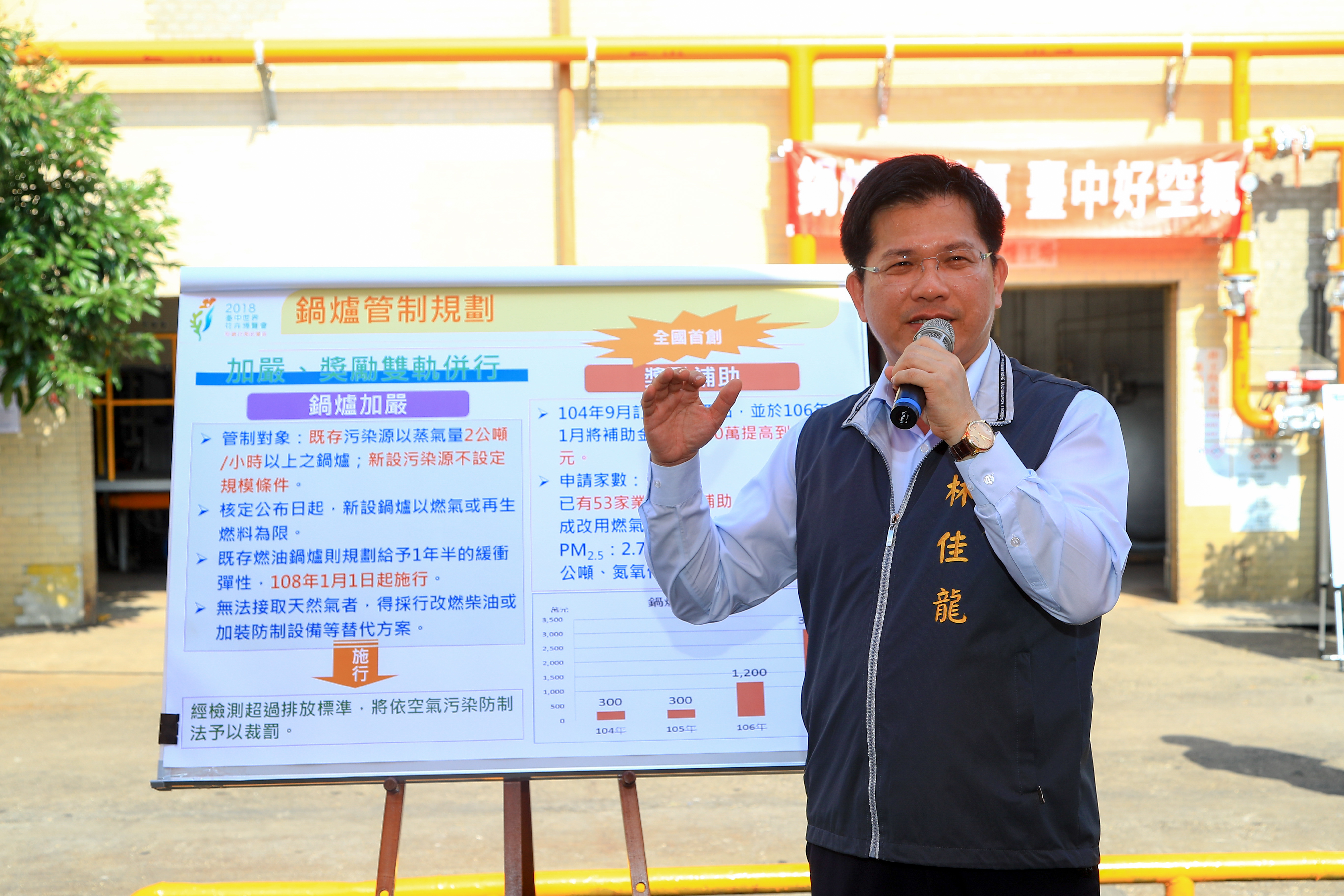 市府在空汙減量有非常多創新作為,其中編列預算,補助企業加速從燃油、燃煤改成天然氣等潔淨燃料,今年提供單一工廠補助上限從30萬提高到50萬元,此外,也加強排放管制,訂定台中市鍋爐空汙排放標準,針對目前台中市181座每小時燃放蒸汽量2公噸以上的鍋爐,作為第一階段加強改善的對象,透過「棍棒」與「蘿蔔」雙管齊下,已有53家工廠改換燃料,市府也限期一年半後,加嚴排放取締,呼籲企業界盡快申請補助,善盡社會責任,利人又利己。