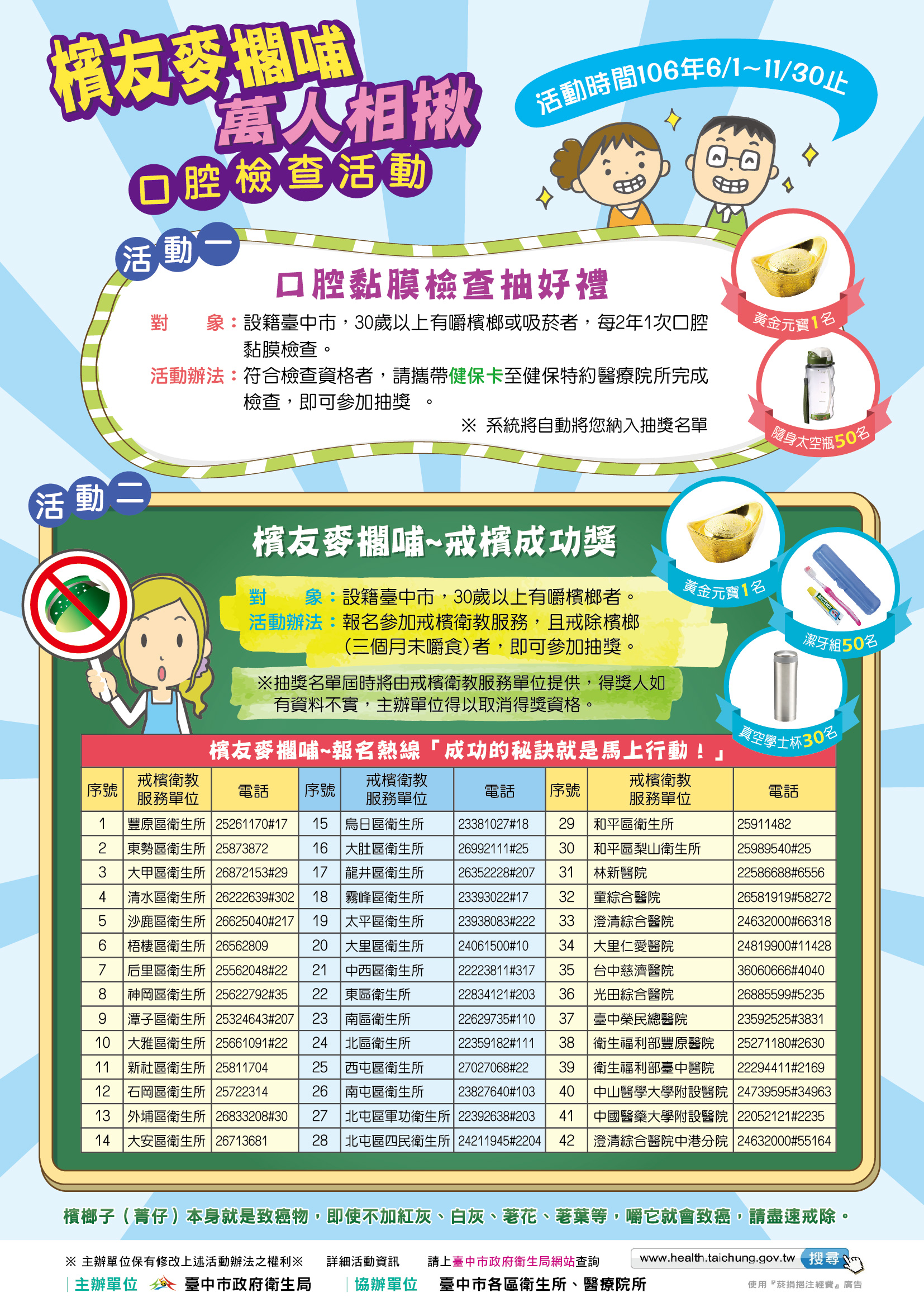 口腔癌為青壯年男性最常見的癌症之一,台中市政府衛生局自6月起舉辦「檳友麥擱哺,萬人相揪口腔檢查」活動,凡年滿30歲有嚼檳榔或吸菸習慣的民眾,攜帶健保卡至健保特約醫療院所,完成每2年1次口腔黏膜檢查或參加戒檳衛教服務,讓自身健康更有保障外,還能參加抽獎把黃金帶回家。