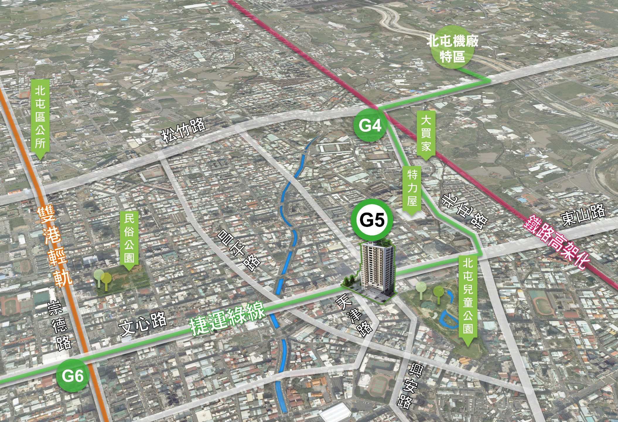 交通局說明,捷運綠線G5站位於東山路與文心路所連貫的東西向軸線帶上,是捷運綠線進出大坑、新社地區的重要門戶,也是東側十期重劃區、十三及十四單元整體開發區進入市區的輻軸要點,潛在人潮可觀。區域周邊生活機能相當完善,附近就有占地高達5公頃、台中第一座以兒童為主題的的北屯兒童公園,往北還有B&Q特力屋、大買家這兩間大型量販店,未來可能還有COSTCO類型的大賣場進駐鄰近的北屯機廠特區,兼具交通便捷與生活品質,因此周邊早已有指標性開發案進駐,各具不同定位取向,也證明該區確實具有多元豐富的發展潛力。