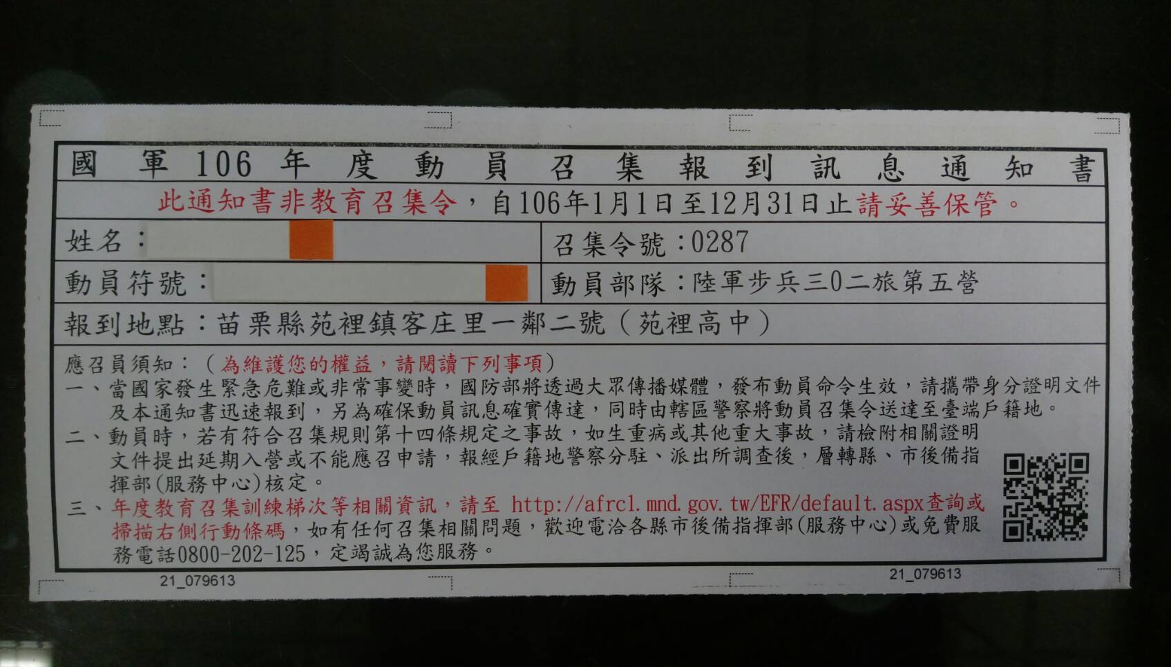 民政局表示,依據兵役法第37條規定,召集種類區分動員、臨時、教育、勤務及點閱召集等5種,國防部現行做法於後備軍人退伍後8年內經動員選編者,每年會收到「動員召集令副本」1次,每2年收到「教育召集令」1次。