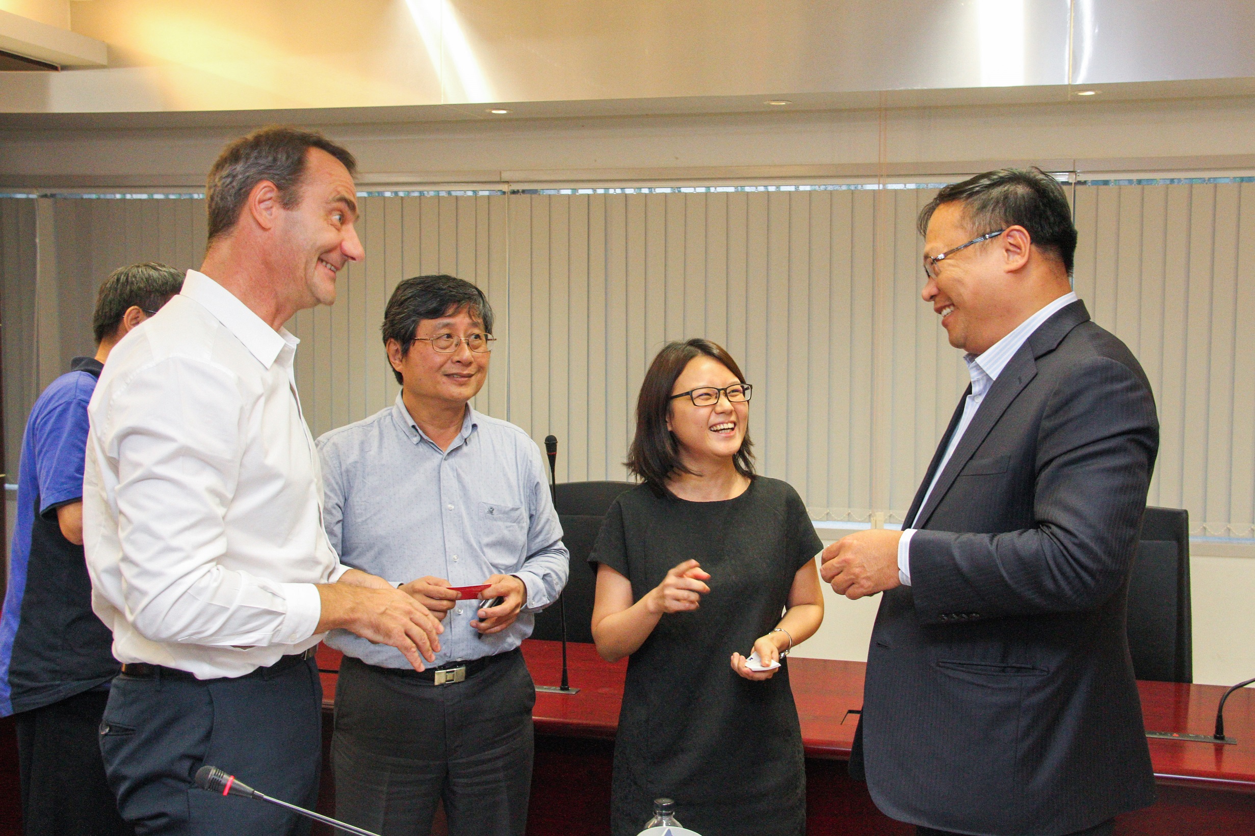 法國自動駕駛電動車廠商NAVYA為尋求與台中市合作的機會,昨(14)日由新加坡分公司總經理Samuel Mathey代表拜訪台中市政府,市府交通局長王義川代表市府表示歡迎,包括法國在台協會商務處商務顧問陳陛瑄、台灣新鈳電子股份有限公司副總經理Provam Hsiao等人也共同與會,Samuel Mathey介紹NAVYA自動駕駛電動車的應用及推廣,並播放影片展示車輛在世界各地的運作方式。