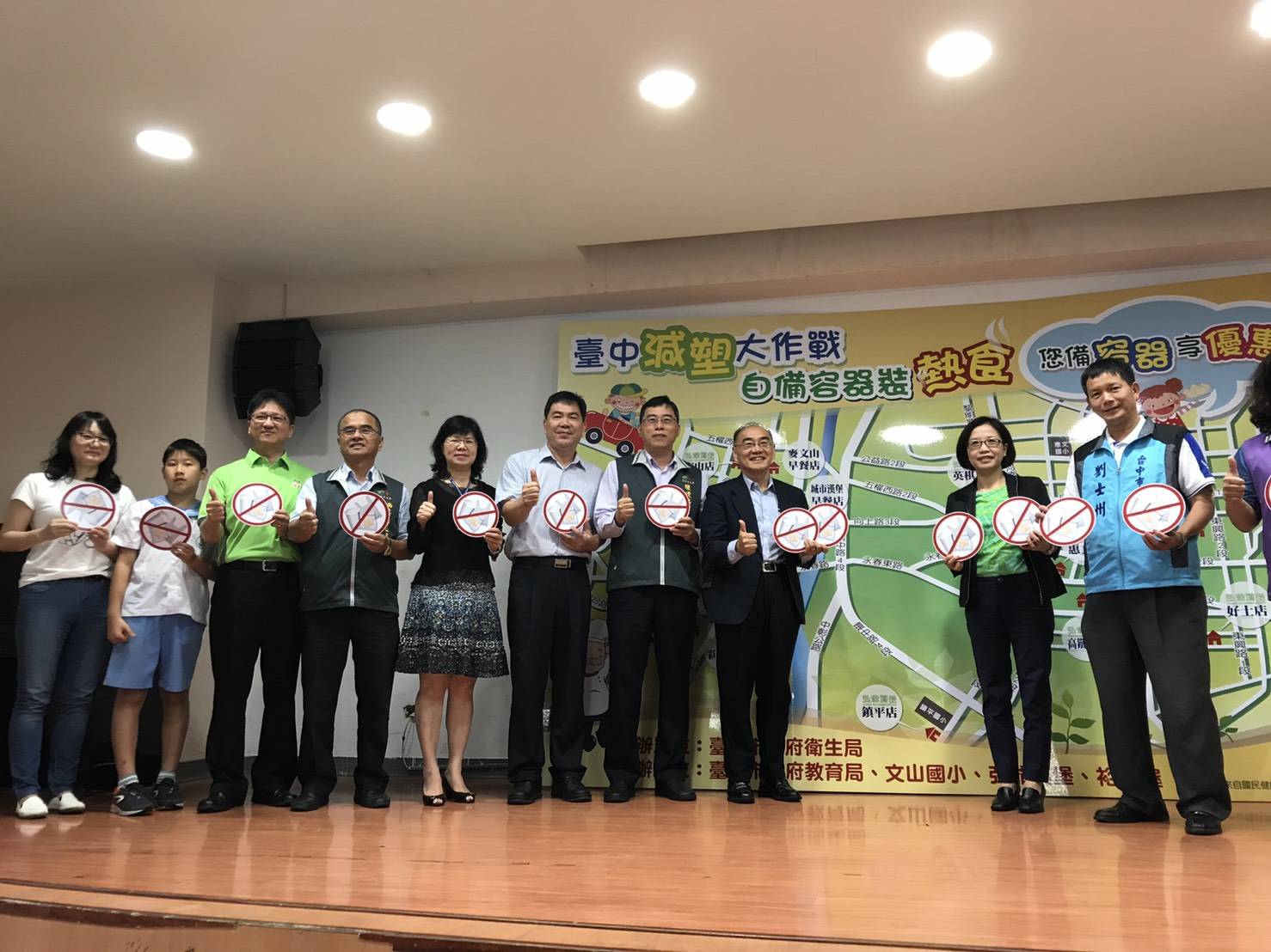 市府衛生局今日在南屯區文山國小舉辦「自備容器裝熱食」記者會,衛生局長呂宗學、教育局專委王淑懿、環保局簡任技正陳政良、文山國小校長邱炳彰等人共同出席,感謝業者共同響應,包括市議員朱暖英、劉士州及裕毛屋董事長謝明達、弘爺早餐店業務處協理湯茗閎也到場一起宣導,呼籲民眾參與減塑大作戰。