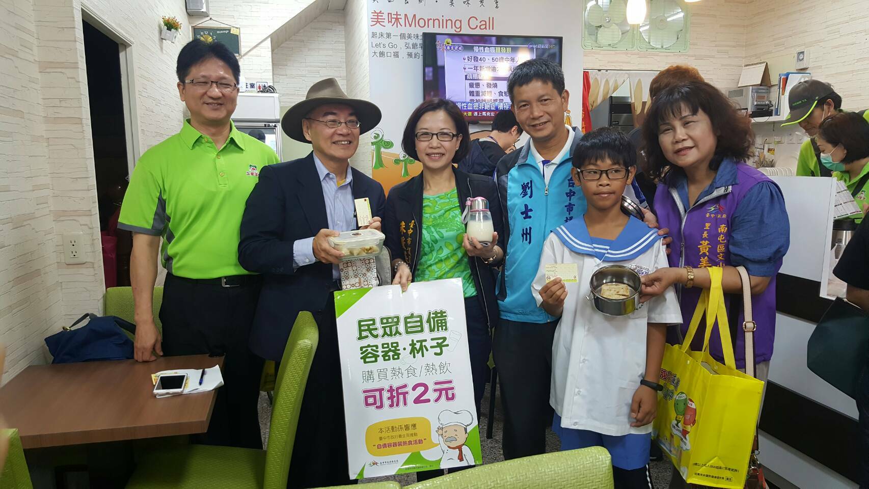 為推廣民眾減少使用一次性用品,避免將紙碗、紙餐盒、塑膠蓋、塑膠袋、免洗湯匙等免洗餐具中的塑化劑吃下肚,台中市政府衛生局今(19)日起於南屯區文山國小校園周邊試辦「自備容器裝熱食」減塑活動,獲當地16間早餐店共同響應,自備容器裝熱食的民眾至活動早餐店除可享受每個容器2元折抵優惠外,參加集點還可獲得保溫提袋,做環保又可拿好康。