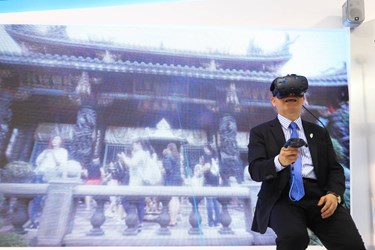 巴黎航空展台灣館國際記者會20日登場,除林市長外,駐法辦事處大使張銘忠、漢翔副總經理林南助、中科院院長杲中興等人與會,現場並簡報台灣航空產業、國防產業概況及參展業者的最新研發技術,林市長並戴上VR眼鏡,親身體驗精密機械的虛擬實境技術。