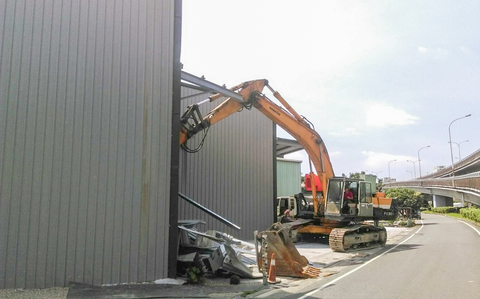 今天強制拆除作業,市府出動大型恐龍嘴破碎機、燒切機、車輛等共5台各式機具及人員11人,現場指揮官按標準作業程序,於確認外水、外電已切斷後,於下午1時30分開始執行拆除,預估需2個工作日完成拆除。