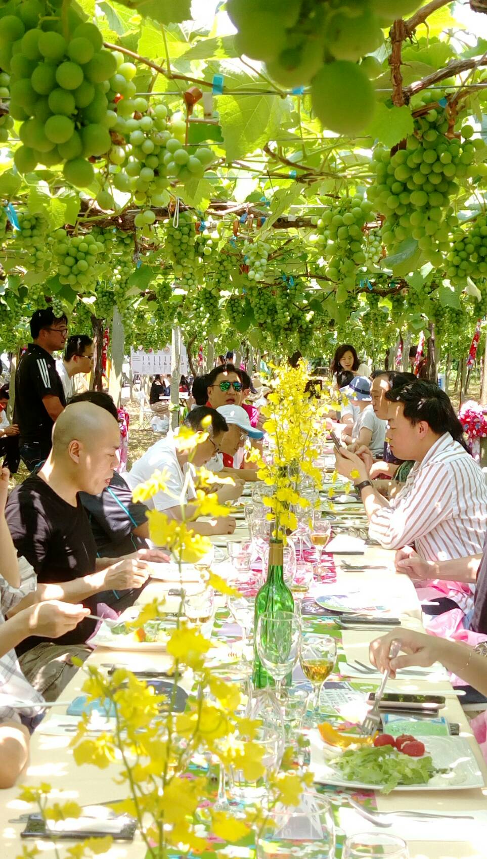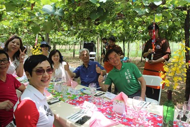 這次交通部香港辦事處主任蔡宗昇與華航香港分公司總經理鍾婉君,帶領30多家香港績優旅行社高層主管來台中,市府特別整合外埔區公所、農會及在地水流東休閒農業區,在成串的金香葡萄樹下、悠揚的小提琴樂聲中,結合在地聞名的紅龍果及葡萄酒辦理大地餐桌美食宴,受到香港業者驚艷歡迎。
