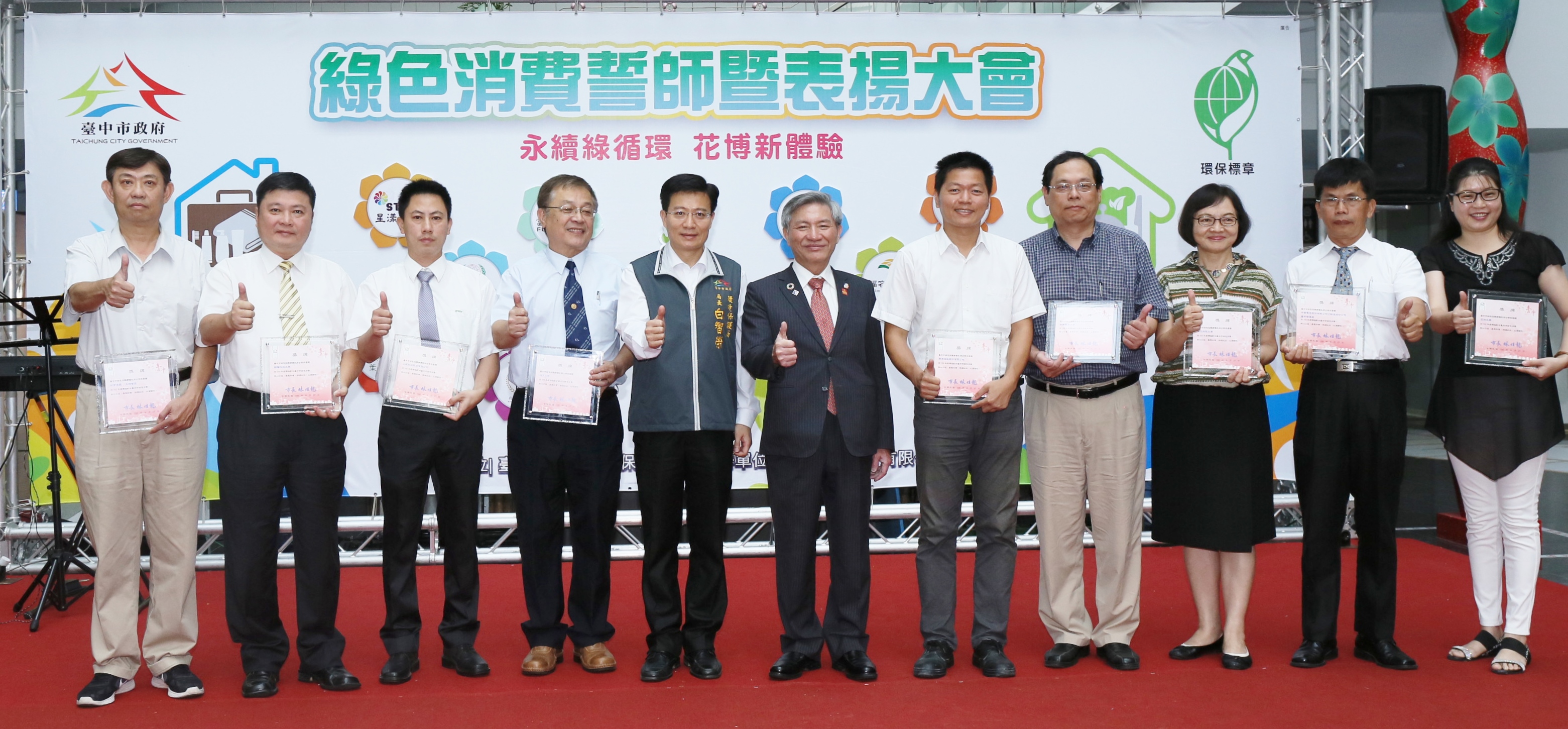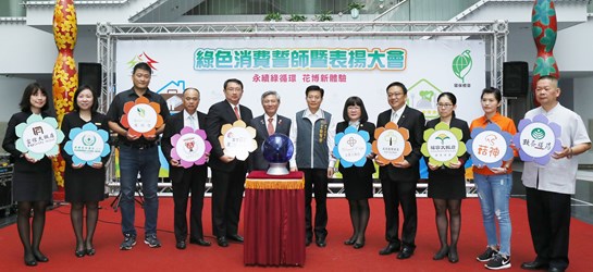 今日誓師活動在台灣大道市政大樓惠中樓一樓中庭舉辦,副市長張光瑤、環保局長白智榮也親自出席,與環保旅店及環保餐館績優廠商等10家廠商代表,將業者LOGO看板張貼於活動布幕,象徵「永續綠循環,花博新體驗」。