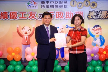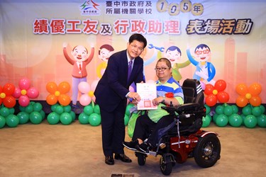 他指出,台中市工友(含技工、駕駛)約有1,500多人、行政助理約有4,800多人,通過初審的工友僅有47人、行政助理則有81人,再經過複審選出績優工友20人、績優行政助理40人,競爭相當激烈,可以說是「百中選一」;因此,他堅持要一個一個頒獎表揚,表達對他們的感謝與敬意。