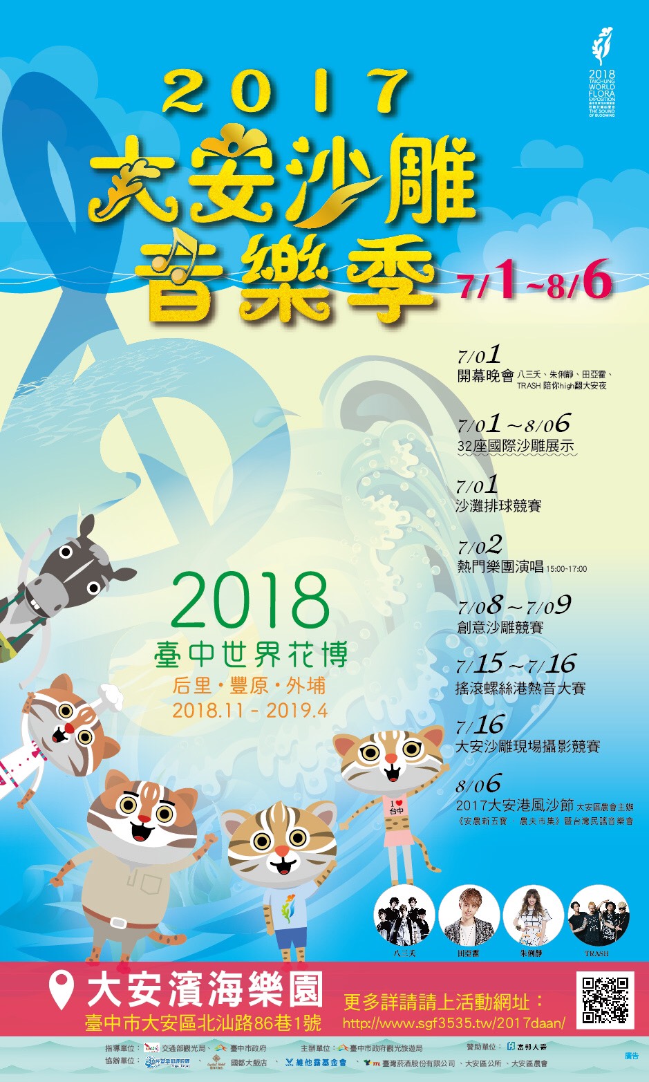 今夏最搖滾的台中音樂盛事「2017大安沙雕音樂季」將於7月1日在大安濱海樂園盛大開幕!邀請八三夭樂團、田亞霍、朱俐靜及TRASH樂團為音樂季揭開序幕,將熱鬧進行至8月6日;「2017台中市伊斯蘭開齋節慶祝活動」也將於7月1日在東協廣場盛大展開,邀請東南亞特色的攤商設攤,並有印尼籍外籍配偶身著傳統服飾的舞蹈表演及設置介紹伊斯蘭文化的展板等,精彩可期,歡迎市民朋友親臨現場,一同感受異國文化節慶的歡樂氣氛!