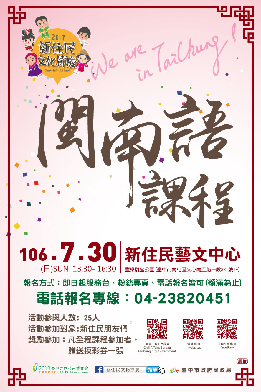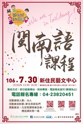 7月30日下午1:30於新住民藝文中心舉辦「新住民文化節慶-閩南語課程」,開放25名本市新住民報名,透過語言傳承文化核心價值,建立和樂家庭,歡迎踴躍參加。報名專線04-23820451。