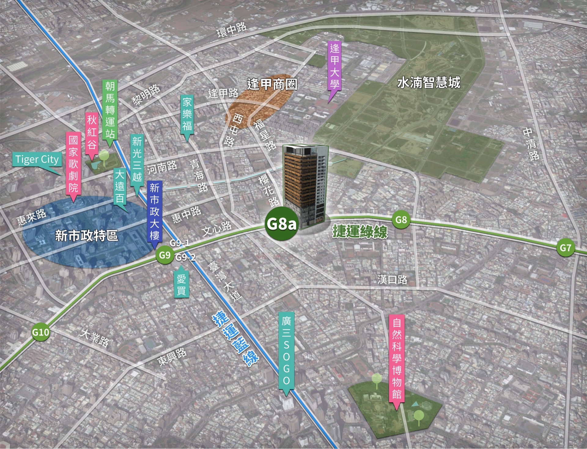 台中捷運綠線G8a土地開發場站,坐落於文心路軸線上,北有逢甲夜市及水湳特區、東有科博館、南有新市政特區,西有秋紅谷與朝馬轉運站,台中市精華地帶全數囊括,坐擁完美生活圈。