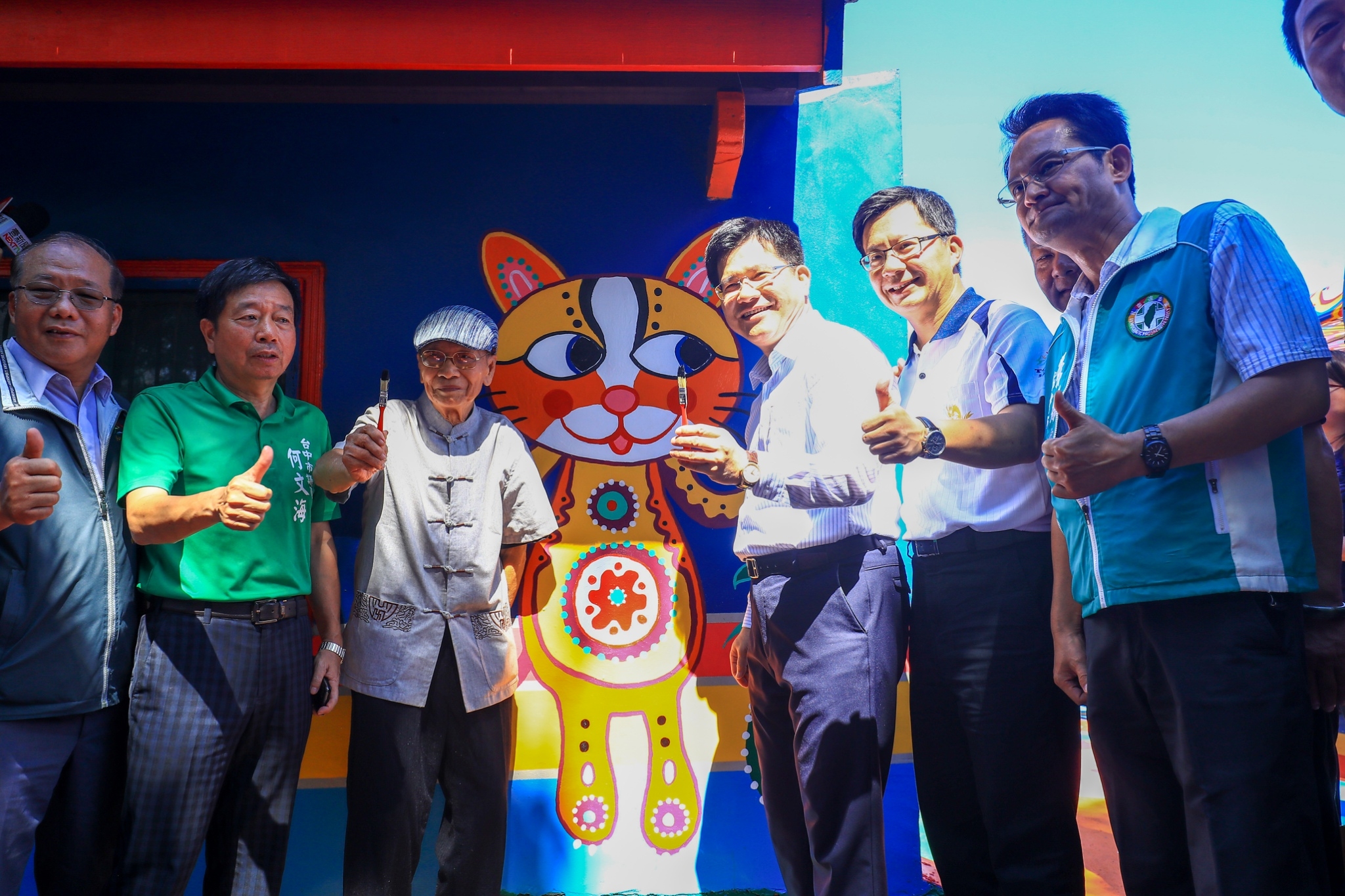 今日「雨過彩虹」彩虹眷村修繕完工記者會,由林市長、彩虹爺爺黃永阜、立委張廖萬堅、市議員張耀中、何文海、劉士州、文化局副局長施純福、南屯區長程泰源、台中家商校長林怡慧、虹牌油漆總經理陳弘偉等人一起為彩虹村模型蓋上新屋頂,象徵市府為彩虹爺爺舉行「入厝」儀式。