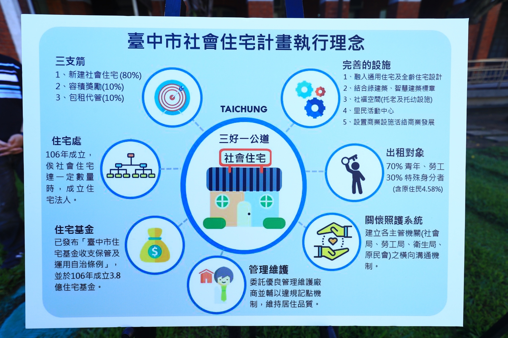 另外,太平區育賢段(一期)已辦理工程發包,北屯區北屯段及同榮段則已積極進行規劃設計作業中,而西屯區惠來厝BOT案亦已辦理第三次公告招商作業等,共計1,781戶,台中市社會住宅進行式正逐步實踐對市民的承諾。