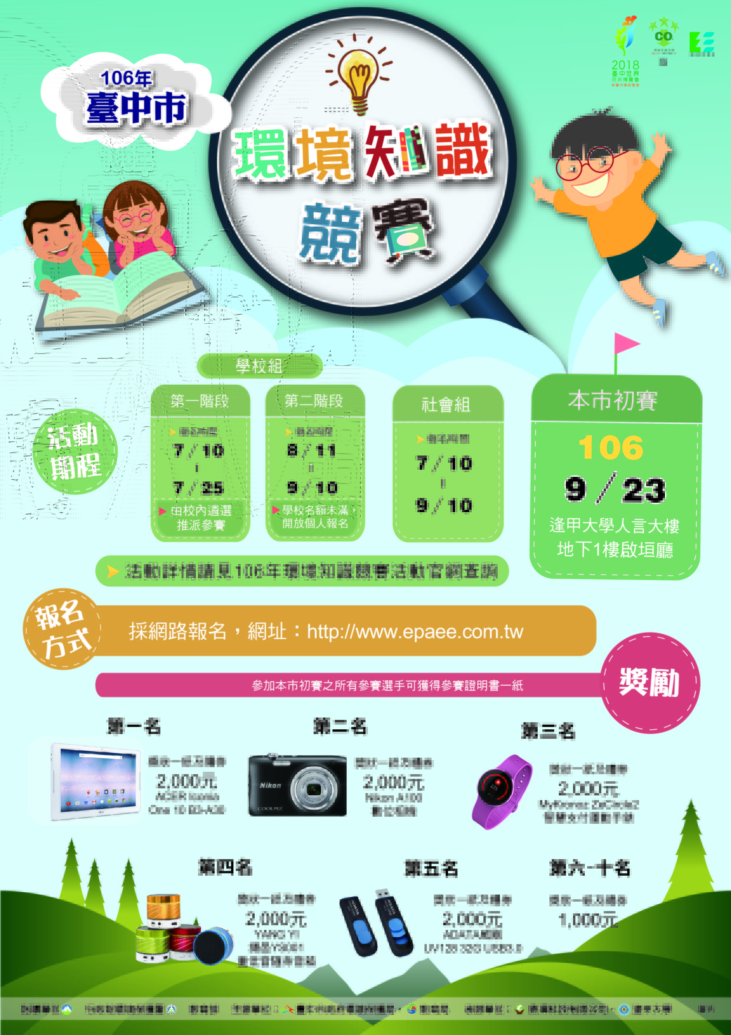 環保局表示,初賽將於今年9月23日於逢甲大學辦理,優勝前五名均致贈獎狀及精美獎品;另第6名至第10名也可獲得獎狀及禮券1,000元,其中各類組優勝第一名將可獲得平板電腦1台,各組前五名也將代表台中參加環保署辦理的全國總決賽,歡迎學生及民眾踴躍報名,為台中爭取最高榮譽及個人豐厚獎金。