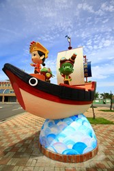 文化局表示,「媽祖行海」為2015年文化局舉辦的媽祖公仔設計徵件比賽社會組首獎作品,由施淳皓設計,裝置藝術總高度為4公尺,長度4.5公尺,寬度1.8公尺,媽祖變身為船長,千里眼、順風耳分別戴上望遠鏡和耳機,而媽祖所搭乘的船舶為「開角花屁股」中式古帆船,是傳統木帆船,船首狀如兩個半開的羊角,稱為「開角」,船艉雕著圖案,稱為「花屁股」;此船型從明朝開始流行於浙閩沿海一代,具有浙閩兩地特色,極具代表性。