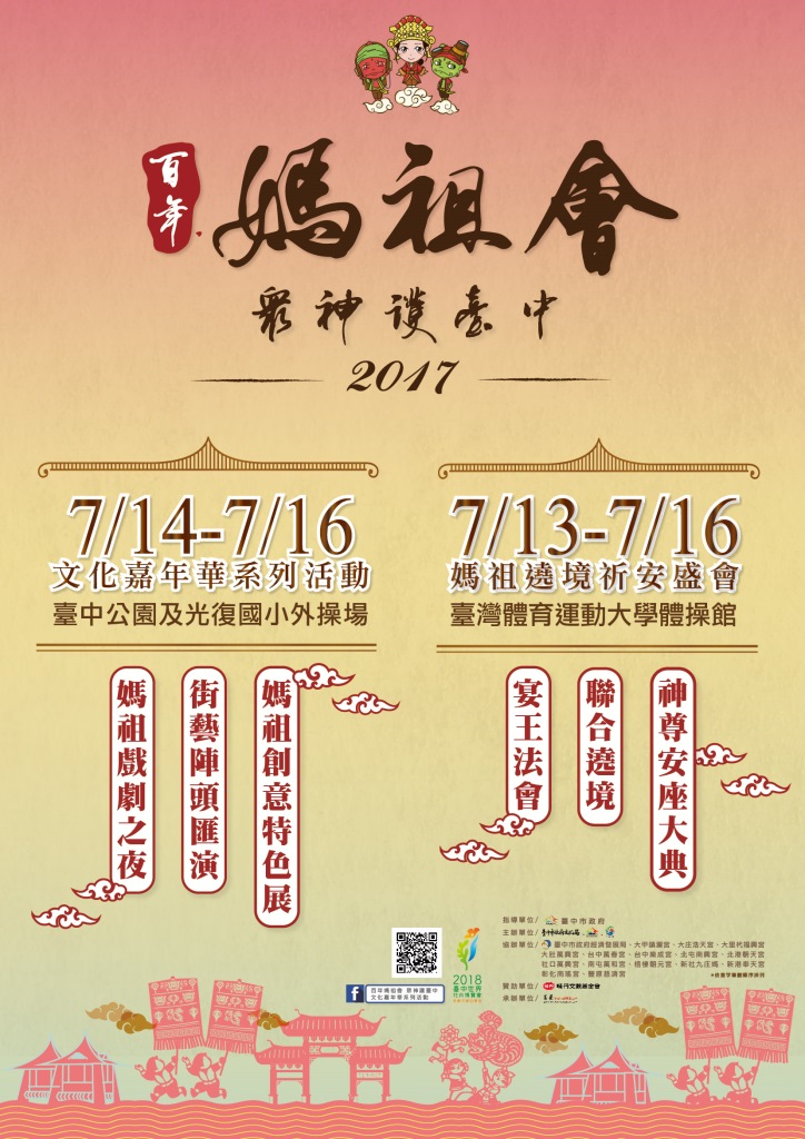此外,新港奉天宮、彰化南瑤宮、台中萬春宮、北港朝天宮、大庄浩天宮、梧棲朝元宮、台中樂成宮等7座百年媽祖宮廟,也會在台中公園「街藝陣頭匯演」區帶來鼓樂、舞獅、電音三太子、遶境隊伍等精采表演;除熱鬧的展演活動之外,還可以參加抽獎,更多文化嘉年華詳細活動訊息,請至台中市政府文化局官網查詢(http://www.culture.taichung.gov.tw/ )。