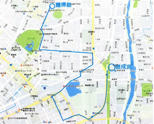 預計15日8時從台灣體育運動大學體操館(雙十路)出發→右轉精武路→左轉三民路→左轉成功路→右轉市府路→左轉中山路→左轉建國路→右轉南京路→右轉進德路→左轉樂業二路→左轉樂業南路→右轉樂業路→左轉建成路→右轉旱溪街→預計12時30分抵達樂成宮。