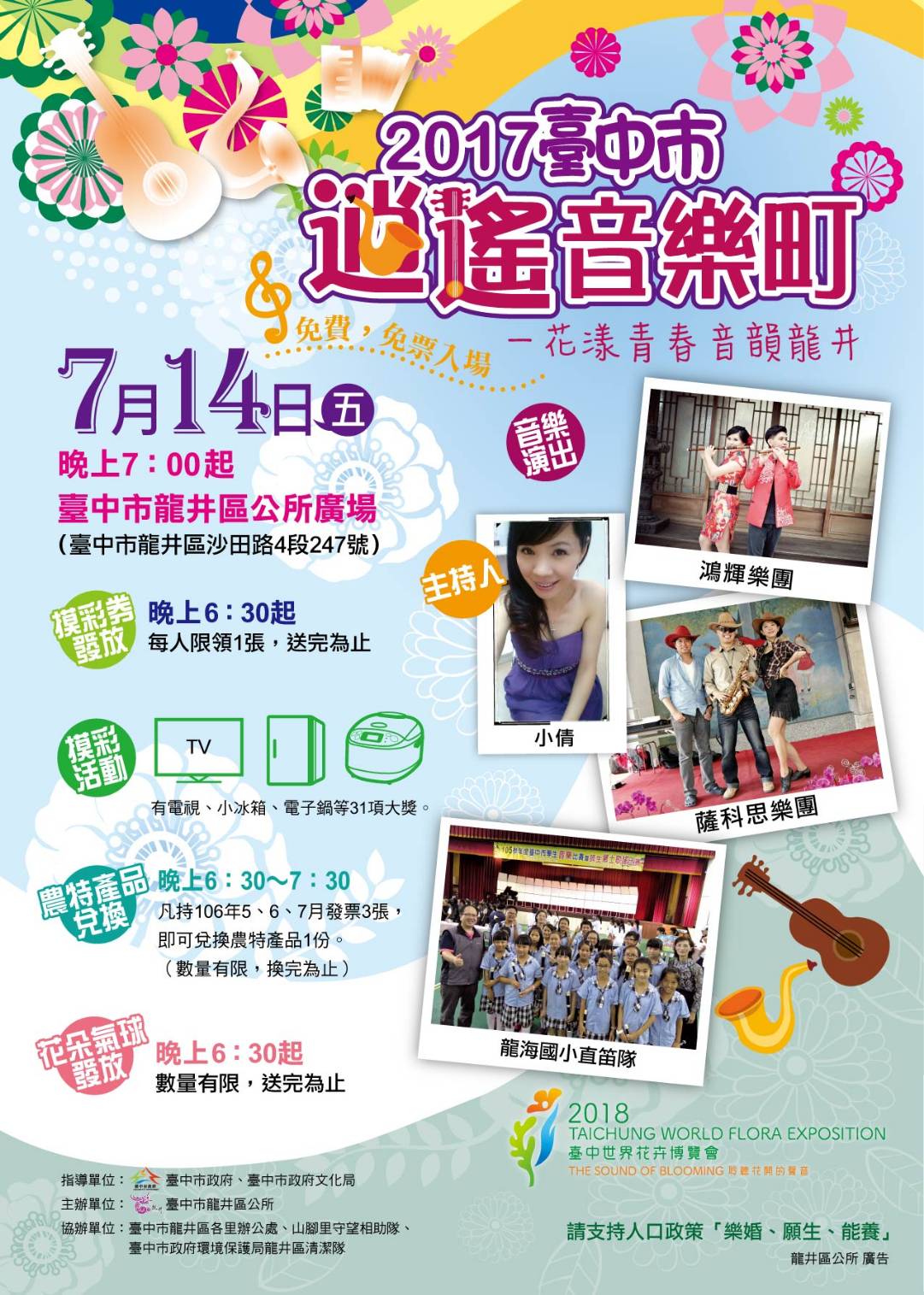 7/14(五)晚上7時在龍井區公所前廣場舉辦,邀請薩科思樂團、龍海國小直笛隊、鴻輝樂團現場精采表演及電台DJ小倩主持,現場持106年5、6、7月發票3張可兌換農特產品1份,更有多項摸彩好禮及花朵造型氣球要送給大家,數量有限,送完為止!