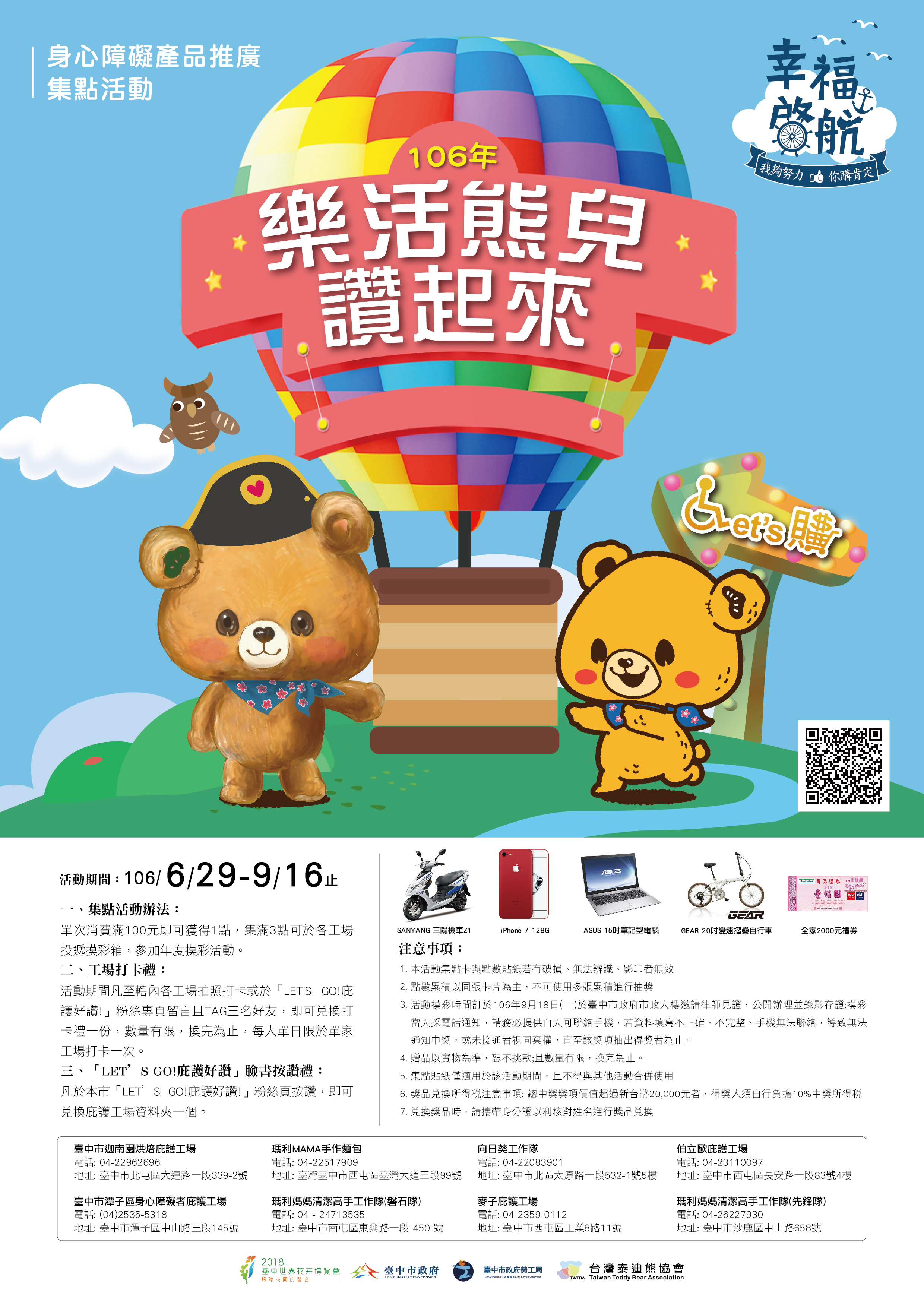 即日起至9月16日止,活動期間凡至全市八家庇護工場打卡,即可兌換樂活熊聯名贈品(送完為止);消費滿三百元還可參加年度摸彩活動,獎品包含三陽機車、Asus筆電與iPhone等多項大獎,歡迎民眾至各工場消費、打卡,活動詳情請上網搜尋「Let’s GO 庇護好讚」粉絲專頁。