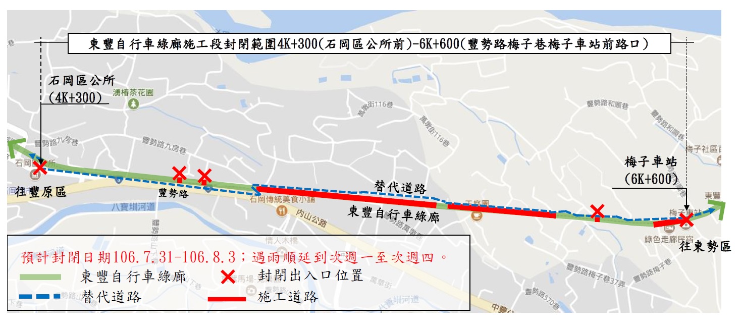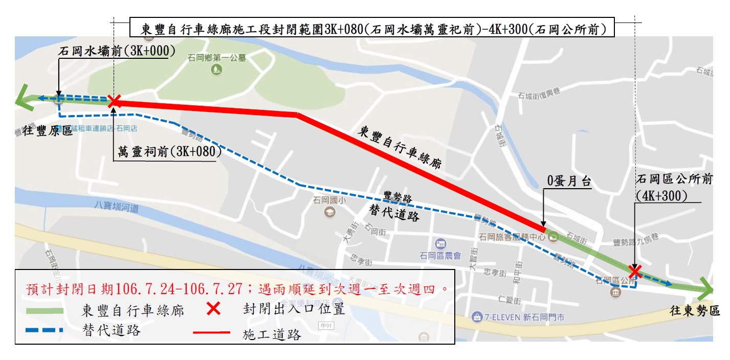 觀旅局表示,7月17日上午8時起至106年7月20日下午7時止,預計封閉朴子街口至萬靈祠段;7月24日上午8時起至7月27日下午7時止,預計封閉萬靈祠至石岡區公所前;7月31日上午8時起至8月3日下午7時止,預計封閉石岡區公所前至粵寧街中路巷口路段。