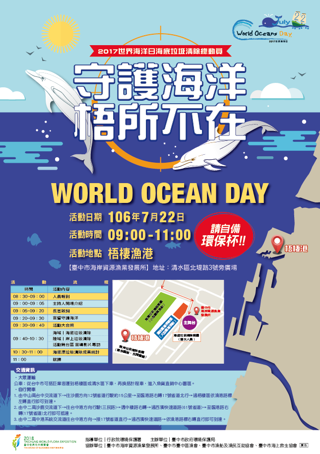 愈來愈多公私力量投入淨灘活動,希望喚起各界對潔淨海洋的重視。台中市政府環保局7月22日將在梧棲漁港舉辦「守護海洋 『梧』所不在」淨港活動,並準備好康大放送,活動不用事先報名,當天請前往梧棲漁港台中市海岸資源漁業發展所集合,體驗最有環保精神的週末假日;7月22日上午10時至下午2時在豐原陽明市政大樓,將有「2017掌握薪機─墩起職涯藍圖」聯合徵才活動,希望招募優質人才為企業注入生力軍,26家廠商將提供近1,400個工作機會,歡迎踴躍參加!