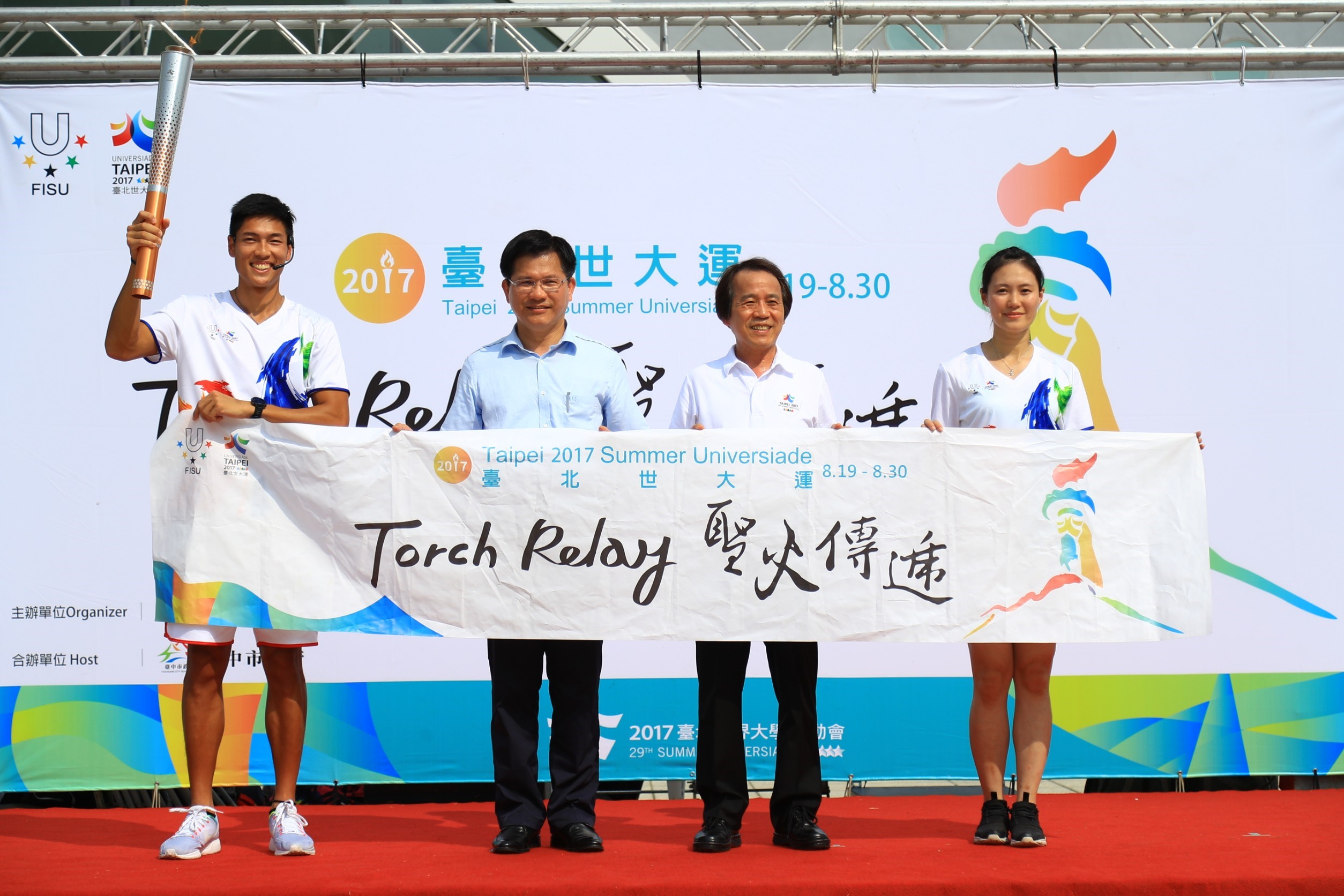 「2017台北世大運」開幕倒數,今(23)日聖火傳遞至台中,市長林佳龍從台北市副市長林欽榮手中迎接火炬,傳承給由台中在地好手陳傑、李育萱、林姵彣組成的聖火隊,從國家歌劇院出發,途經台中市政府、朝馬國民運動中心,終點站至台中洲際棒球場旁的多功能運動中心。林市長表示,聖火傳遞象徵運動家精神,也串連起台灣共同的驕傲,鼓勵全民參與,而台中將舉辦2019東亞青奧,世大運也是最佳觀摩機會。