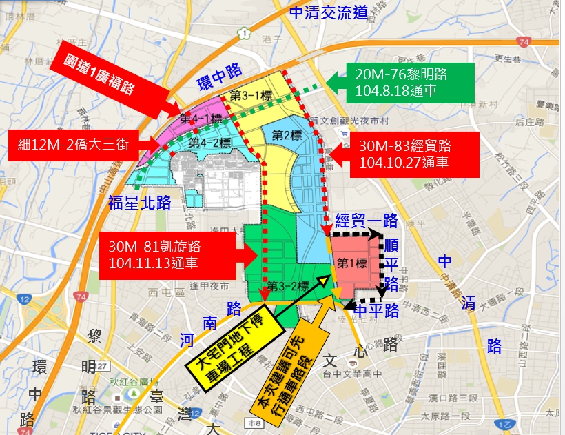 建設局表示,本次開通路段經貿路道路寬度30公尺,長度750公尺,道路佈設雙向各2車道,可銜接至中平路與河南路;其中,大鵬路口由於配合水湳經貿園區區段徵收工程中水道施工,暫時不予連通。