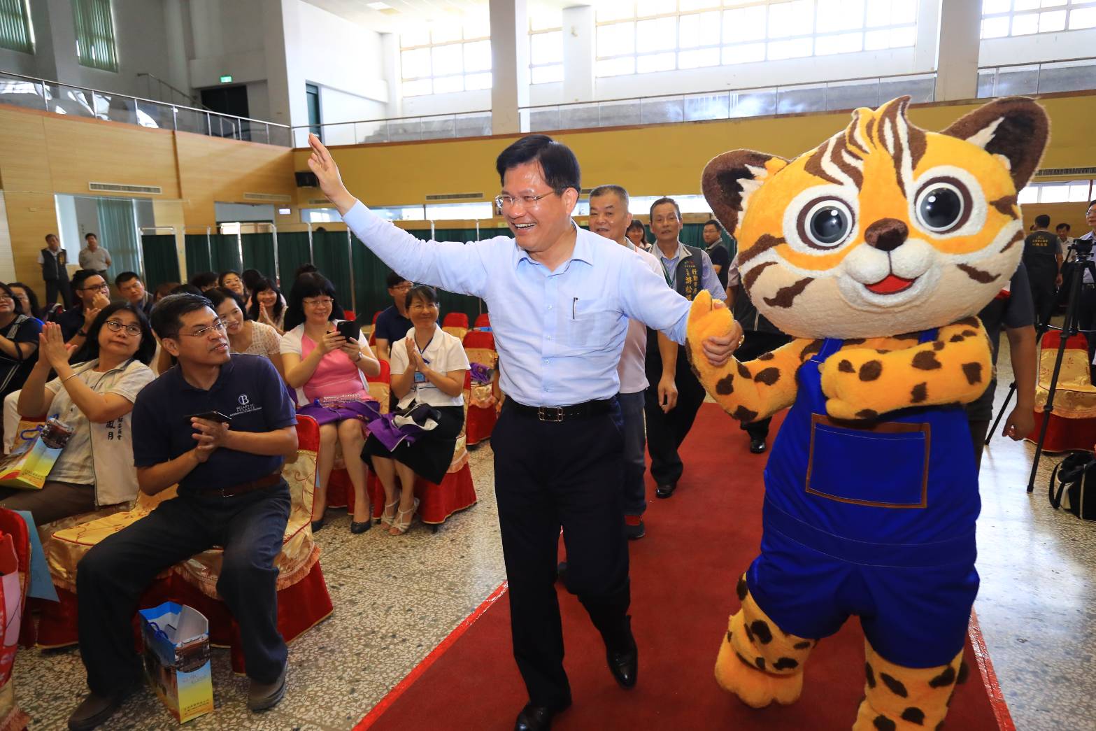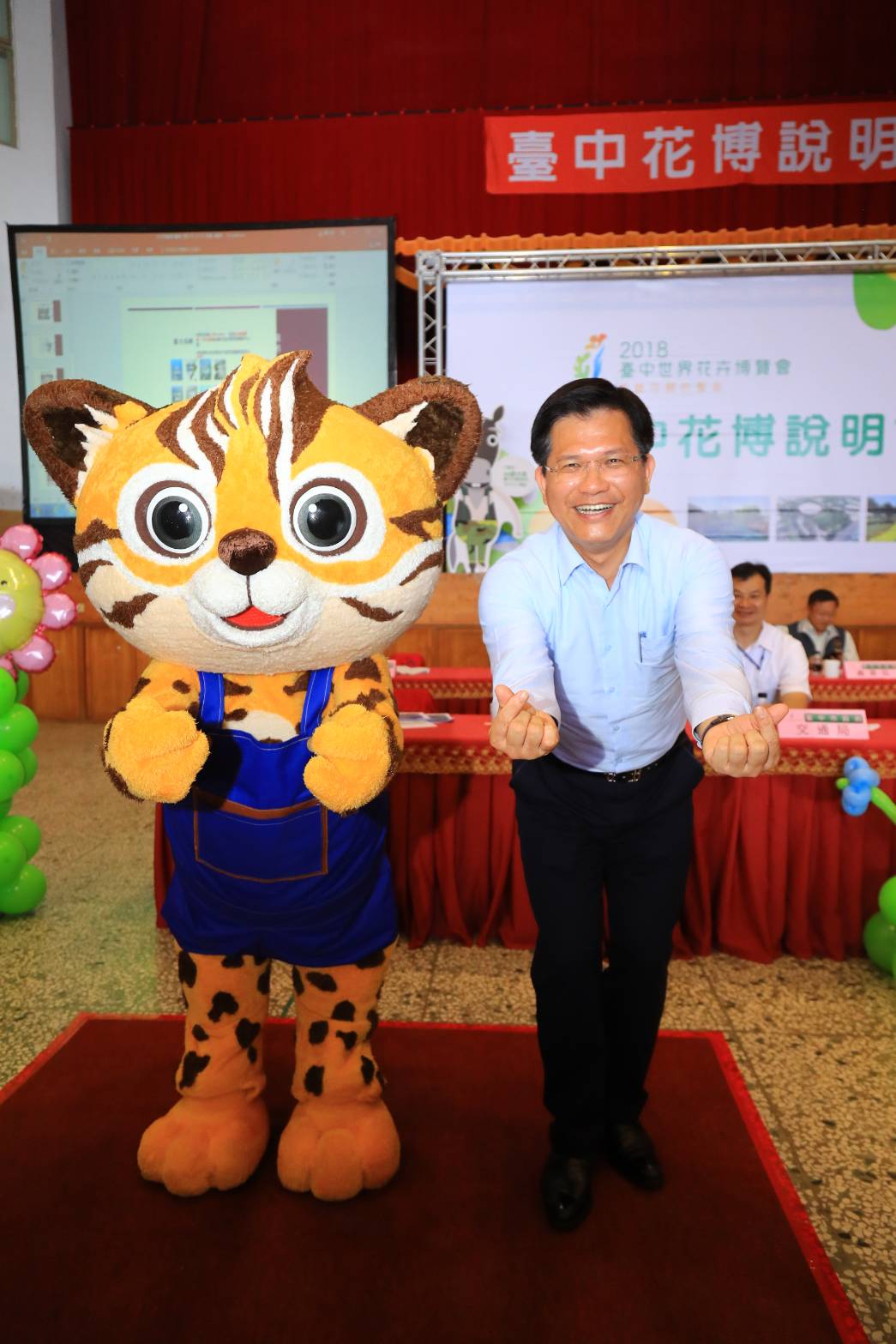 石虎弟弟「來虎」大玩偶與林市長手牽手走入會場,比出愛心三連拍姿勢,與會民眾紛紛拿起手機搶拍來虎弟弟的可愛模樣,氣氛歡樂;市議員李天生,以及張芬郁議員服務處代表、各區里長、多位市政顧問皆共同與會關心。
