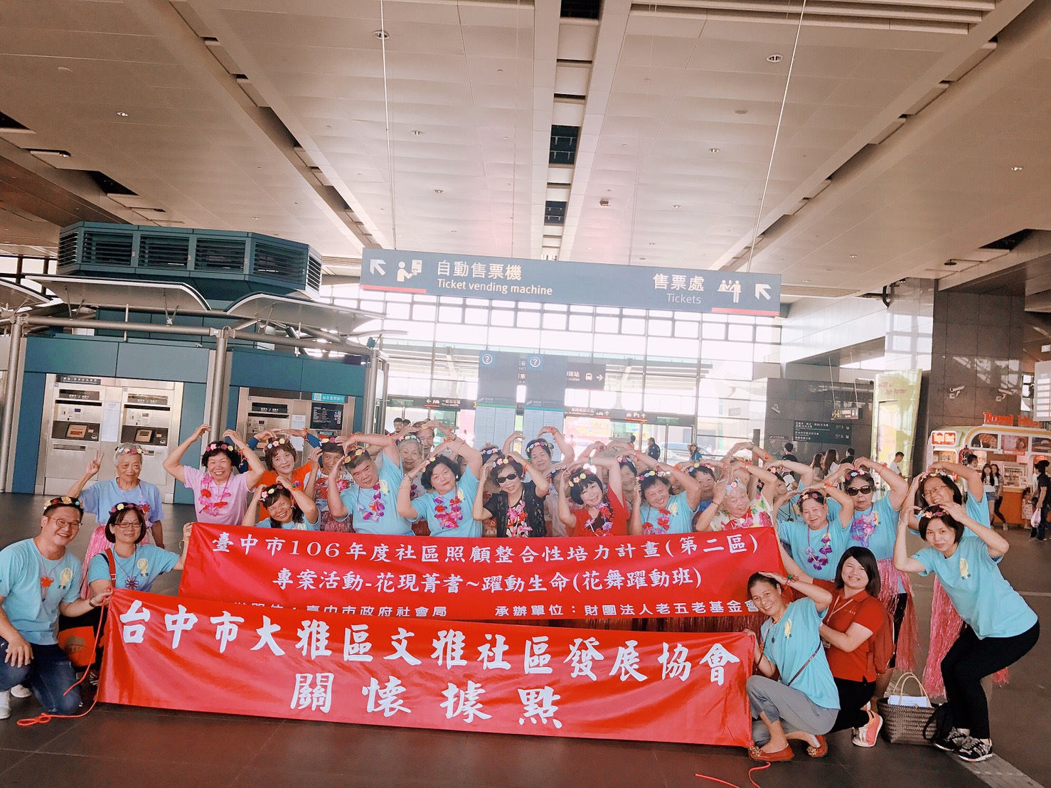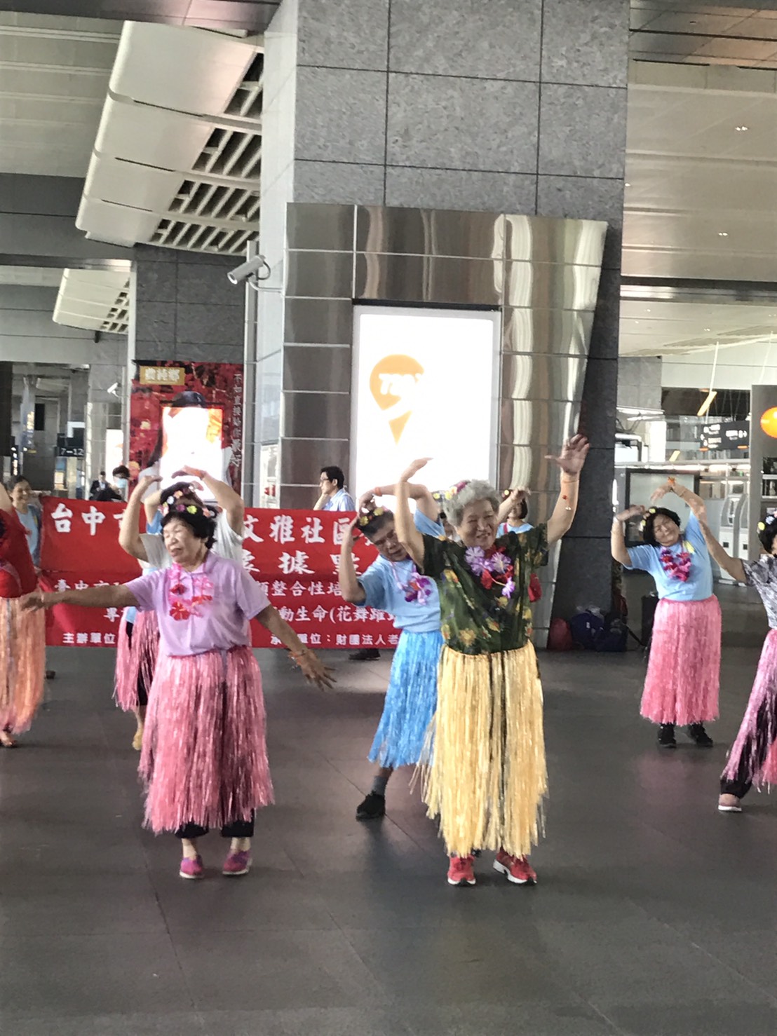 台中市政府推動「托老一條龍-721政策」,發展社區照顧能量,截至今年6月底,全市已有273處社區照顧關懷據點,並以運動及創作性的課程規劃許多活動,導入長輩生活;今(25)日在高鐵台中站,大雅區文雅社區發展協會長輩們穿戴自製草裙與花圈,在老歌夜來香的伴隨下進行可愛又動感的演出,吸引旅客駐足欣賞,也為長者們的活力喝采。後續還會有其它據點的長輩到其他公共場所表演,將歡樂散播各地。