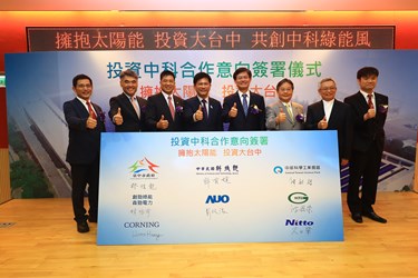今日森勁綠能、創勁綠能電力公司投資中科簽署儀式,由林市長、科技部政務次長許有進、中科管理局長陳銘煌、創勁綠能暨森勁電力公司董事長林恬宇、友達光電董事長彭双浪、台灣日東光公司總經理久田肇及台灣康寧公司副總經理黃誠勳共同簽署,宣示攜手合作發展綠色能源,掌握綠色商機,創造雙贏。