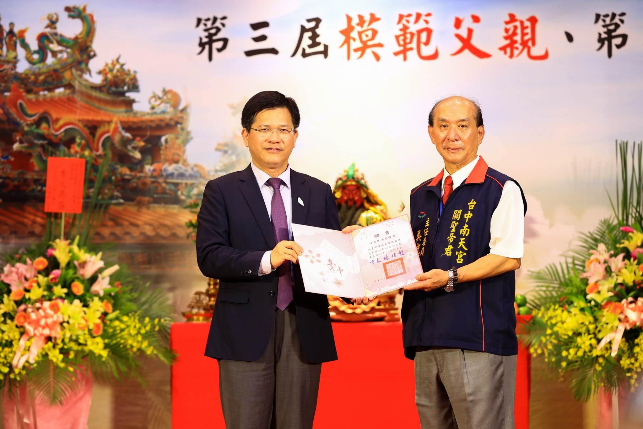 南天宮除舉行模範父親表揚,主任委員吳光雄也領帶領管理委員會長期關懷弱勢,辦理公益慈善事業。林市長今日也頒發市政顧問聘書給吳主任委員,希望未來能邀請他協助市政推動工作。立法委員何欣純、市議員何敏誠、市政顧問林珮涵、林慶芳等人也都出席今日活動,氣氛熱鬧。