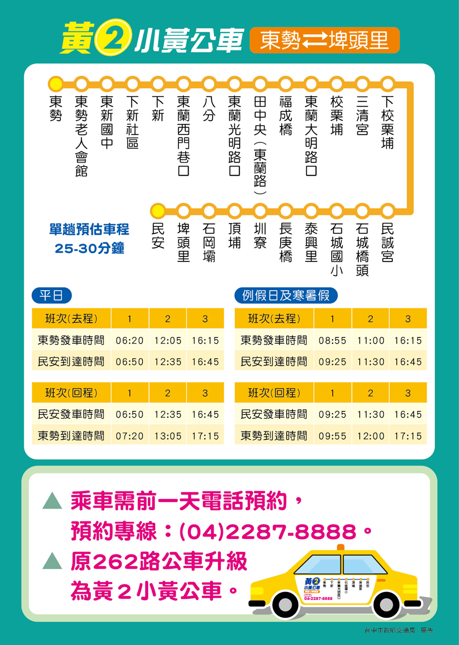 交通局表示,「黃2路公車」車身將貼上公車路線貼紙,讓搭車民眾能一眼就能認出,雖然「黃2路公車」有固定發車時間,但因計程車只能載運3到4人,請乘客務必事先預約搭車,並建議於乘車前一天預約,方便車隊安排車輛,如果預約人數較多也會安排多輛計程車,提供載客服務。預約專線(04)2287-8888,時間上午8時至下午5時,歡迎民眾善加利用。(8/1*14)*交通局