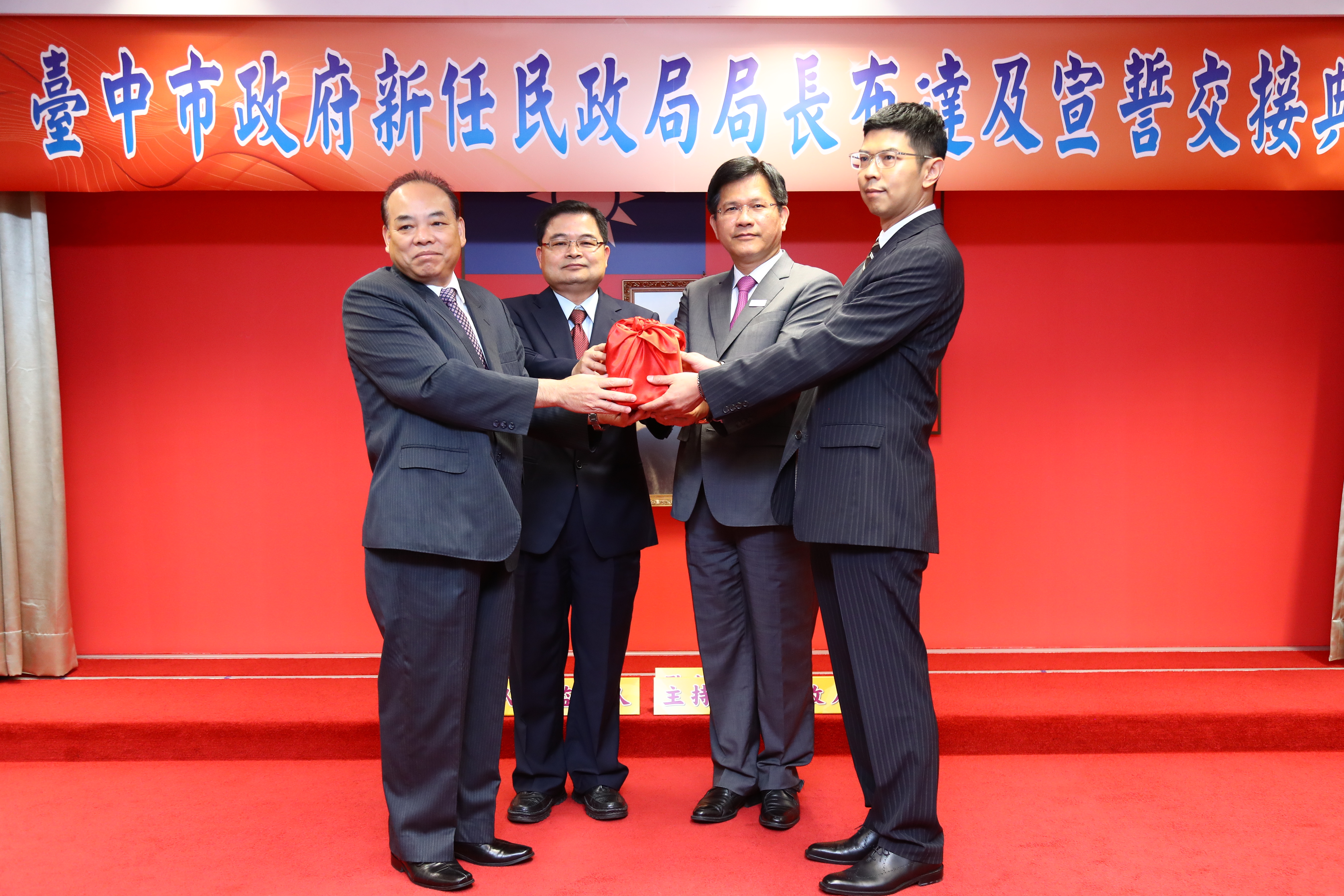 林市長今日主持民政局長交接布達典禮,由主計處長蔣建中擔任監交人,蔡局長將印信移交給新任周局長,完成交接儀式,典禮簡單隆重。包括市議員何明杰、各區區長、戶政事務所主任及多位民進黨台中黨部代表也到場觀禮。